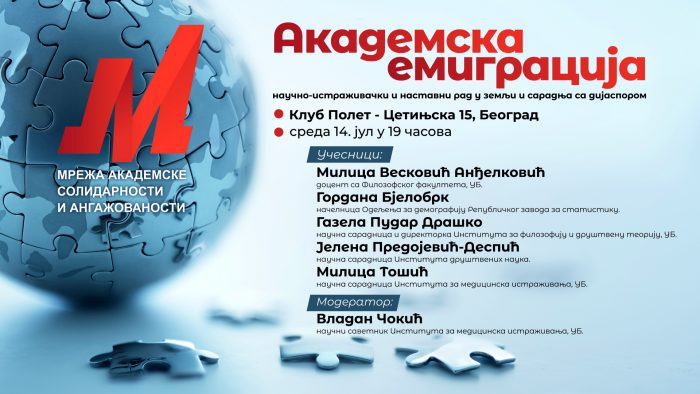 U okviru studije o akademskoj emigraciji, Mreža akademske solidarnosti i angažovanosti (MASA) organizuje 14.07.2021. u 19 časova u klubu Polet (adresa Cetinjska 15, Beograd) tribinu pod nazivom: Akademska emigracija – naučno-istraživački i nastavni rad u zemlji i saradnja sa dijasporom. Anketu o akademskoj emigraciji je popunilo 1130 istraživača i nastavnika iz Srbije i dijaspore. Cilj […]